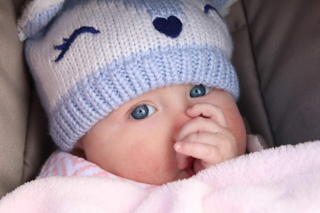 Our blue-eyed girl staying warm under her fawn hat- our ode to the deer as a national symbol of Scotland.