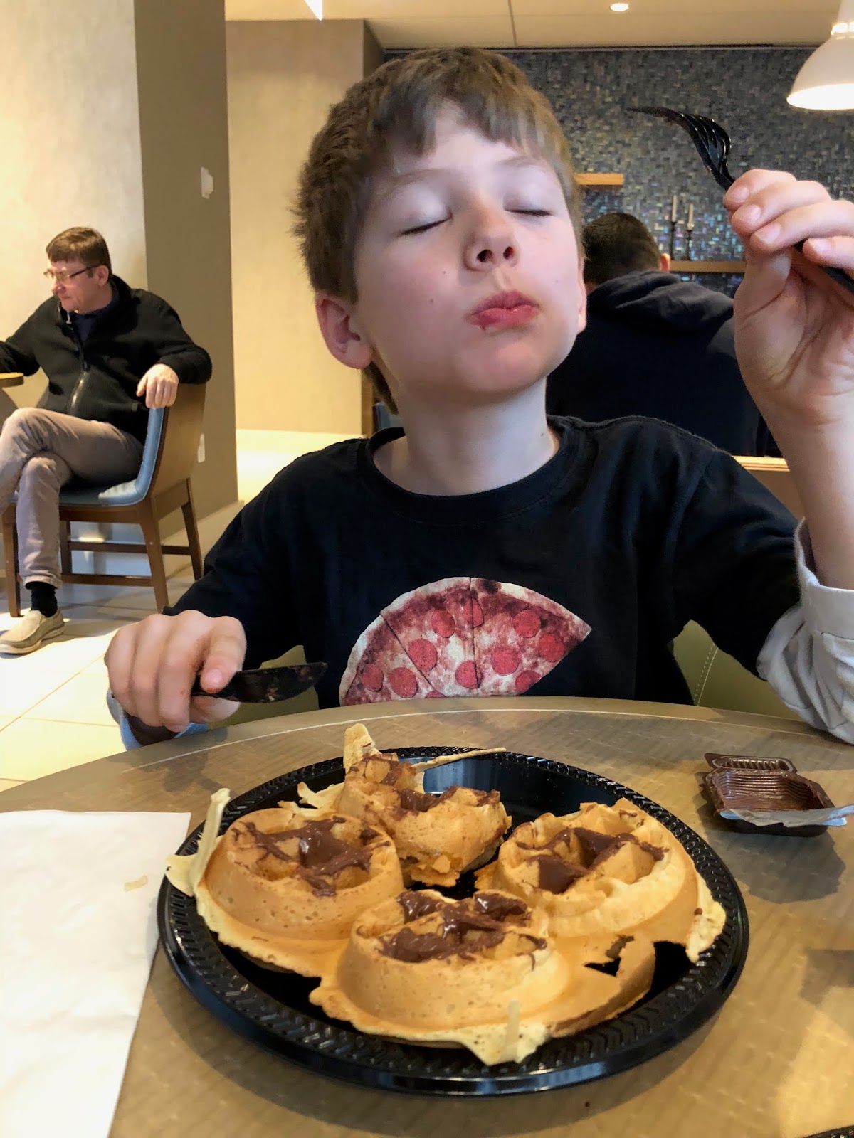 Tuesday was James’ birthday. His ninth birthday! Chris took him down to breakfast, just the two of them, before he went to work and James got to choose whatever he wanted to eat. His choice was waffles with Nutella and syrup.
