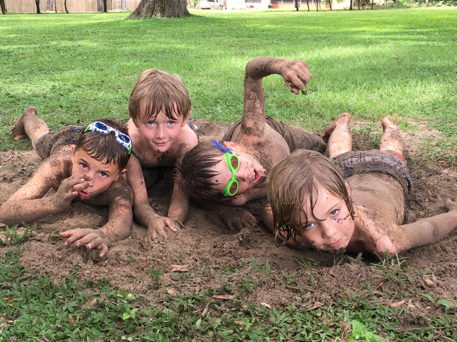 Hose in backyard leads to mud which leads to very dirty and very happy little children. |