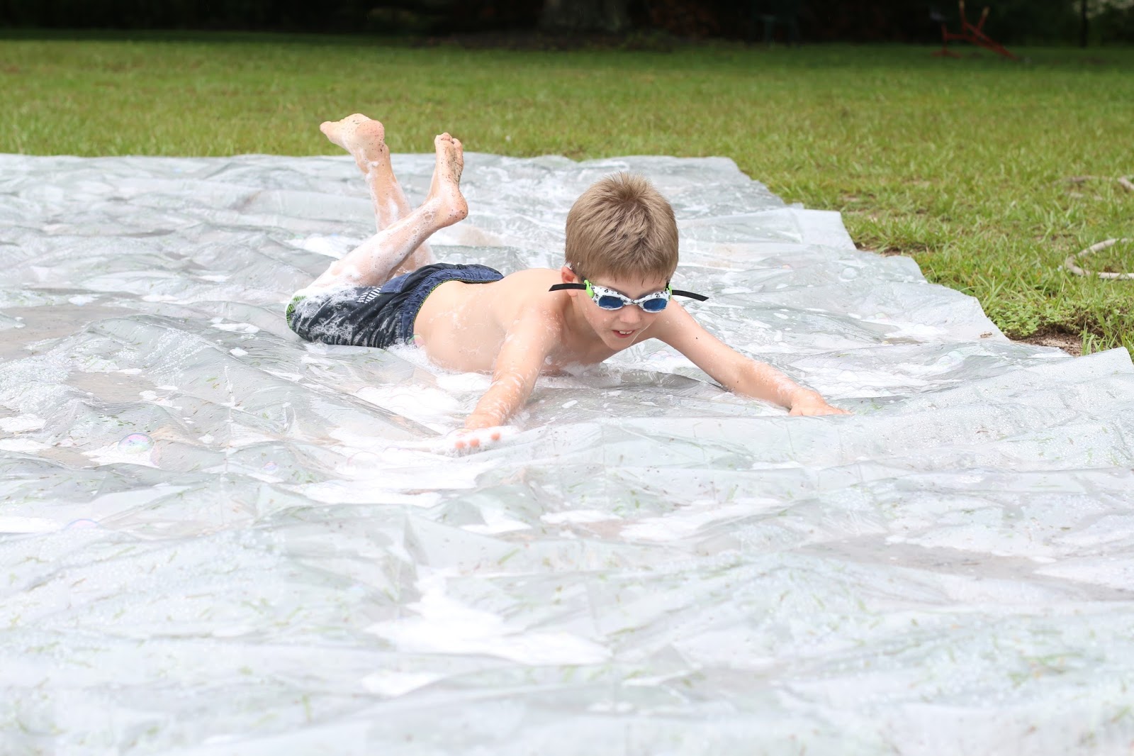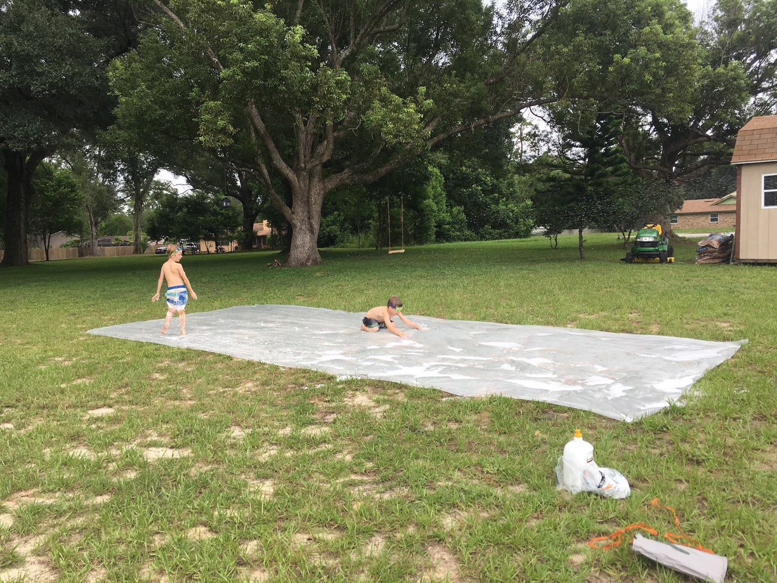 Giant sheet of plastic + dish soap + water hose = slip-n-slide fun! |