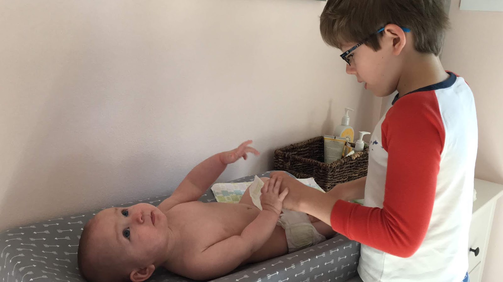 James learned how to change Ellie’s diapers. He continues to wow us with his great big brother skills. |