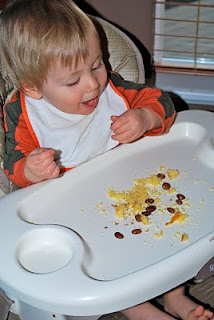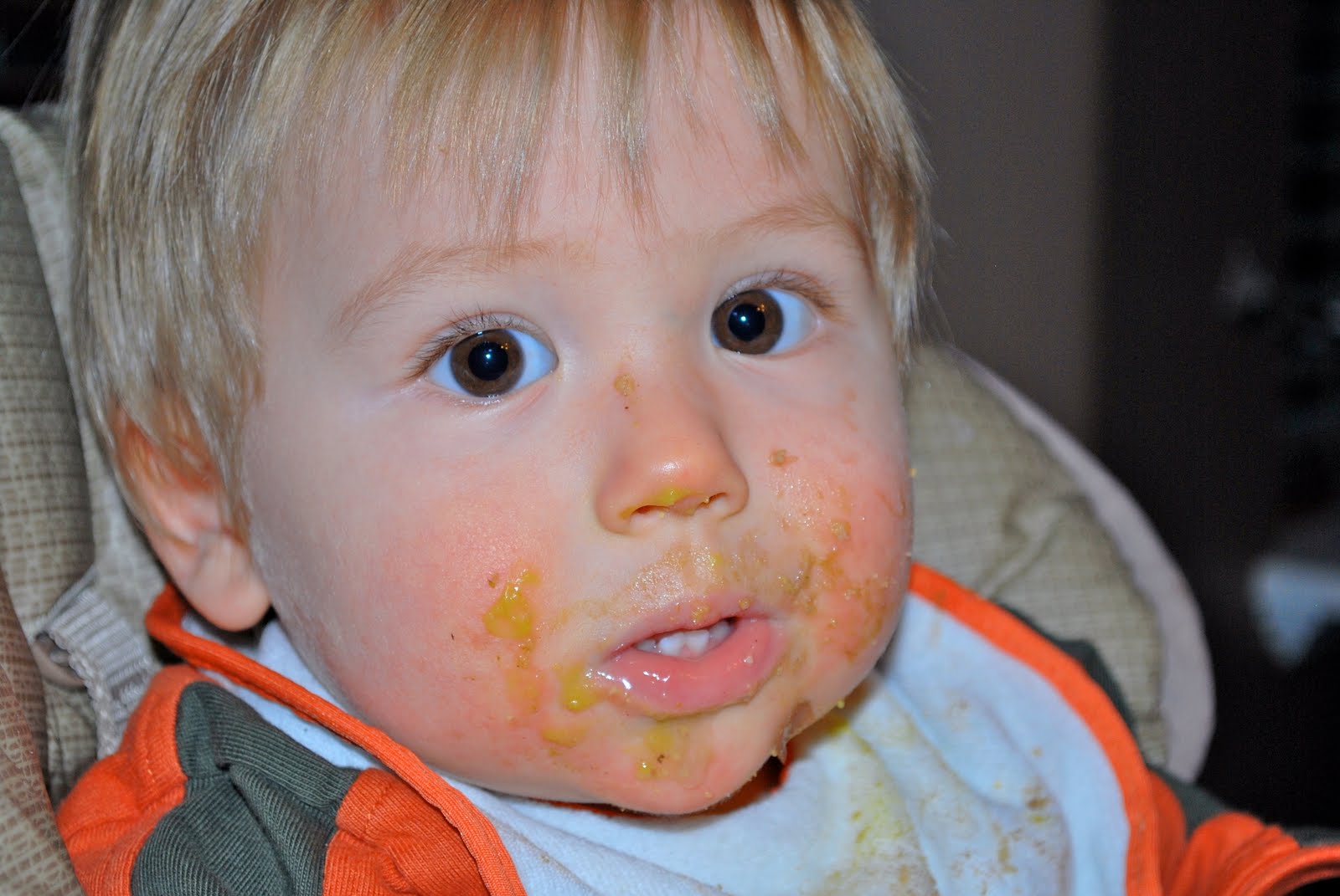 Here’s how things looked towards the end of the meal… and yes, that is a bean on top of his head. He deliberately placed it there, for reasons known only to himself.