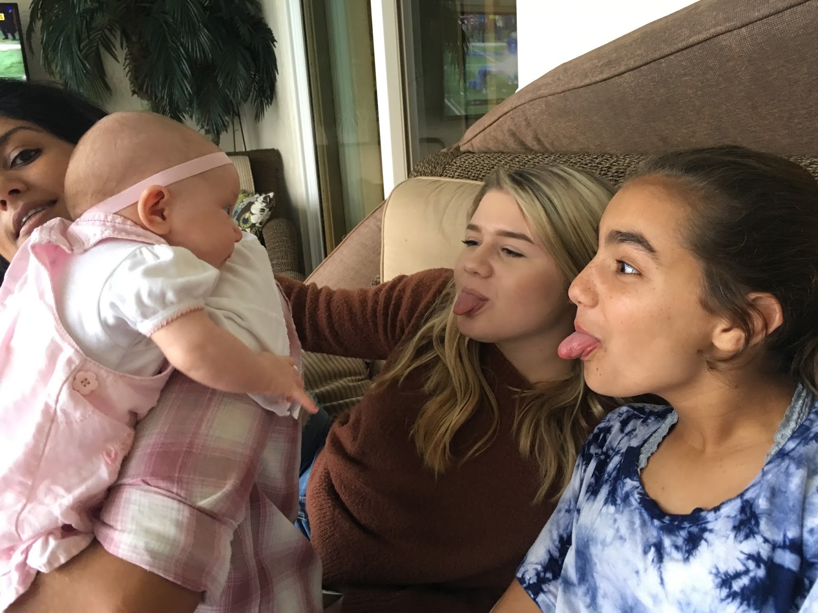 Cousins Hope & Taylor try to get Ellie to stick her tongue out at them, while she hangs out with Aunt Ayesha.