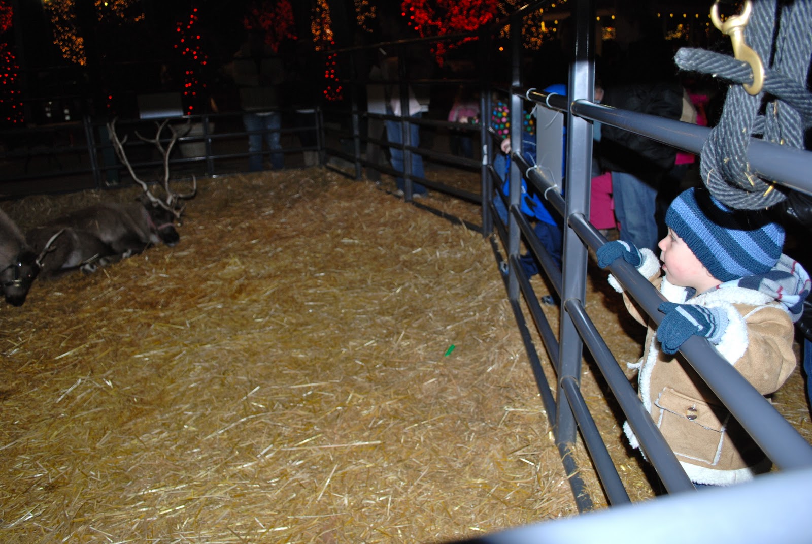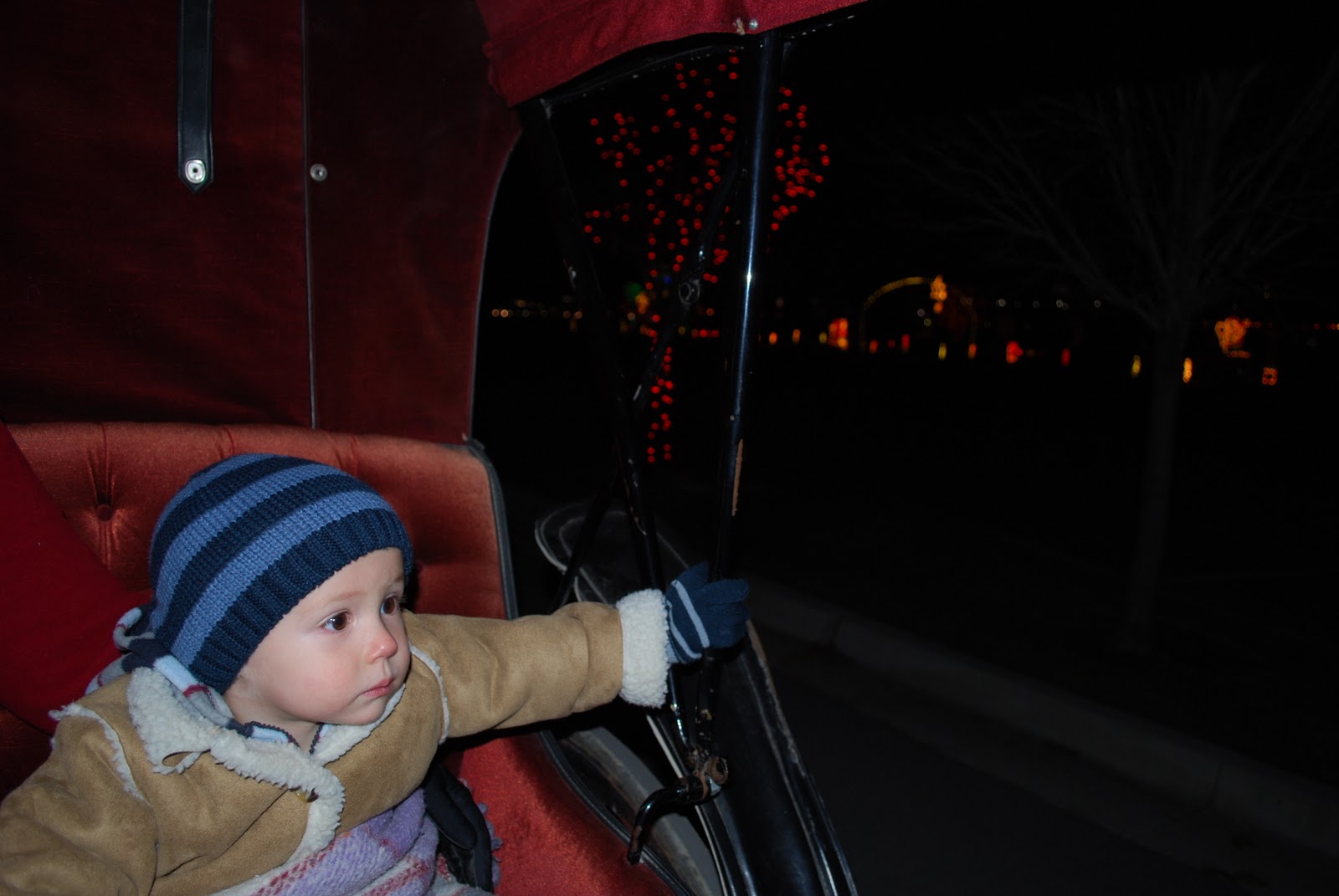 James loves Christmas lights! He can say it reasonably well and he loves to point them all out and talk about all the different colors. We are really enjoying this holiday season with him as he discovers new things and learns new words every day. Last night, we took a horse-drawn carriage ride through the Holiday Lights display at Thanksgiving Point (Thanks, Pop) and James was mesmerized. First it was the “horsey” pulling the carriage, then the lights themselves, and then he discovered the carriage wheel just below (of course). After the carriage ride, we checked out the reindeer on loan here from Santa. James was done after about 2 minutes and ready for the next thing. I guess if Rudolph isn’t there, he’s just not that interested.
